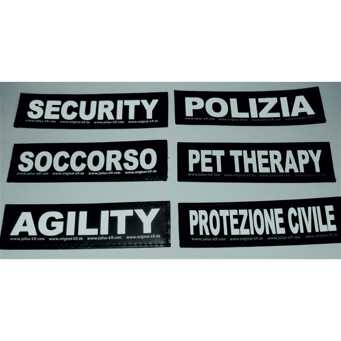 Etichette in Pvc con scritte bianche riflettenti su fondo nero e strappo posteriore.